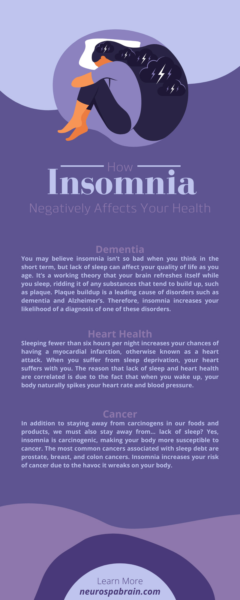 You may believe insomnia isn’t so bad when you think in the short term, but lack of sleep can affect your quality of life as you age. It’s a working theory that your brain refreshes itself while you sleep, ridding it of any substances that tend to build up, such as plaque. Plaque buildup is a leading cause of disorders such as dementia and Alzheimer’s. Therefore, insomnia increases your likelihood of a diagnosis of one of these disorders.