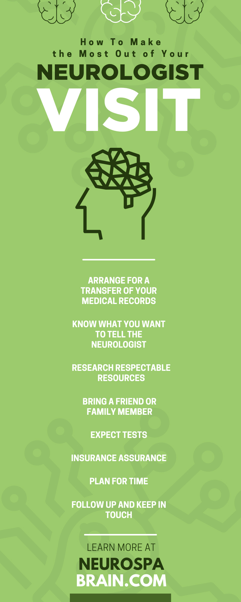 Here’s our last tip on how to make the most out of your neurologist visit. Follow your doctor’s orders, keep to the schedule and medication they assign to you, and be sure to schedule and keep all future follow-up appointments. Keep the lines of communication open and continue to record changes in your health, so you’re prepared for those appointments as well.