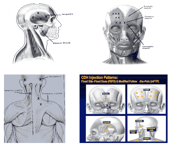 The figures below show typical injection sites for OnabotulinumtoxinA: